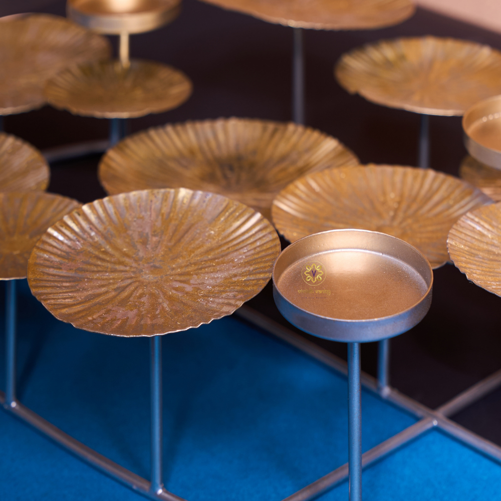 The Golden Orbit is a celestial-inspired centerpiece crafted from galvanised iron in a radiant metallic gold finish. Designed with moon-like circular frames for potpourri, dried flowers, or décor accents, it also features elevated t-light holders that add a soft, glowing warmth to your space. Perfectly blending art and ambiance, this piece is a modern tribute to cosmic harmony and luxurious living. Whether placed on a dining table, console, or festive setup, Golden Orbit creates a radiant statement wherever it rests.