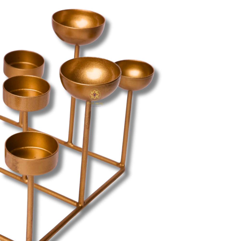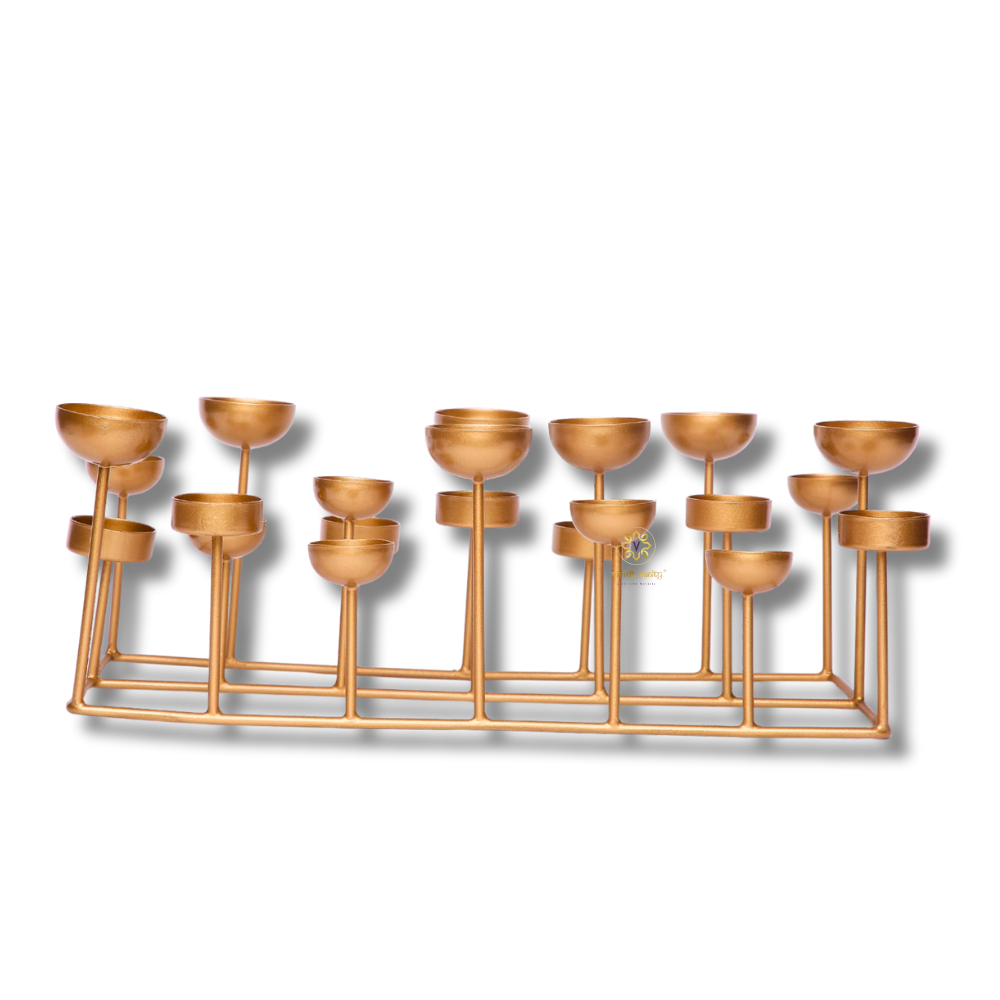 The IllumeCraft 21 is a striking fusion of modern minimalism and festive elegance, designed to hold 21 tealights in a sleek aluminium frame. With varying stem heights and a clean geometric layout, it creates a captivating play of light and shadow, perfect for both traditional celebrations and contemporary décor. The golden finish adds a touch of luxury, making it a statement piece for living rooms, entrances, or event spaces. Lightweight yet sturdy, it’s ideal for creating a warm, inviting ambience during Diwali, weddings, or intimate gatherings. Whether styled with candles, flowers, or seasonal accents, this piece is as versatile as it is beautiful.