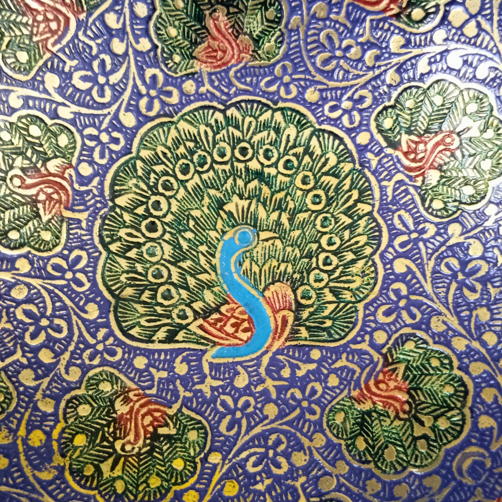 The Nilambari Bowl is a regal ode to tradition, named after the Sanskrit word “Nilambari” — meaning “clad in blue”. Crafted in fine brass and hand-embellished with intricate Meenakari enamel work, this pedestal bowl features a rich royal blue base, graceful wavy edges, and a cascade of peacock and floral patterns. Whether placed in a living space, festive setup, or pooja corner, the Nilambari Bowl exudes timeless elegance and the soulful artistry of India’s decorative heritage.