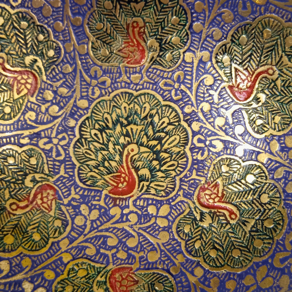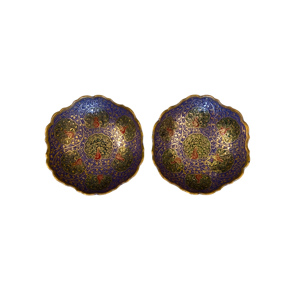The RajNeel Set brings together royal heritage and artisanal finesse. Handcrafted from polished brass and enriched with intricate Meenakari enamel work, this elegant pair of wavy-rimmed bowls showcases majestic peacock motifs set against a luxurious deep blue backdrop. The name "RajNeel" — meaning Royal Blue — captures the essence of opulence, tradition, and timeless beauty. Perfectly sized for gifting or styling, this set adds a royal accent to both festive and contemporary spaces.